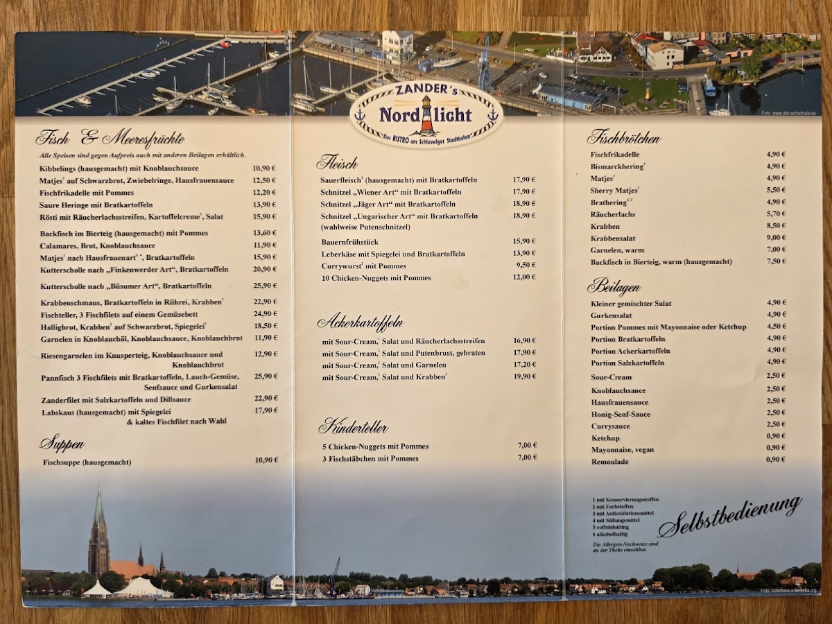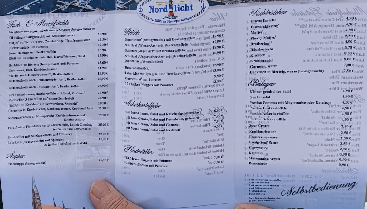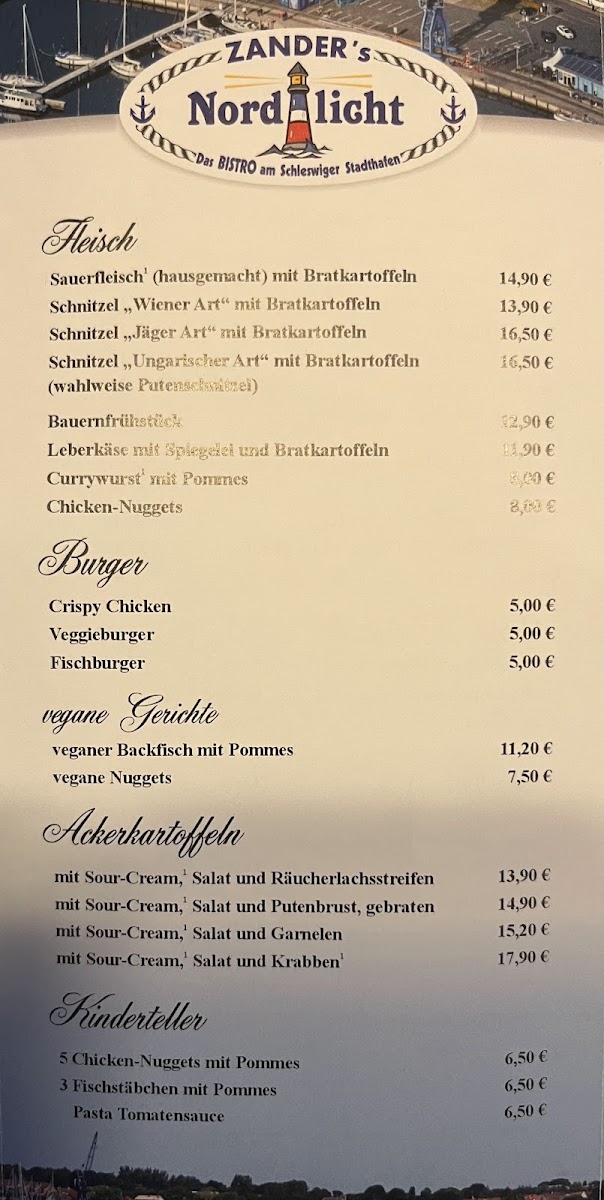 Introducing the menu at Bistro Zander's Nordlicht, a hidden gem located at Am Hafen 1, Schleswig, Germany, where seafood lovers can indulge in a culinary experience that highlights the bounty of the sea. The menu primarily features a delightful array of fresh fish dishes, beautifully prepared and served warm or as hearty sandwiches. Diners can enjoy classics like the Matthias and Hering, each bursting with flavor.